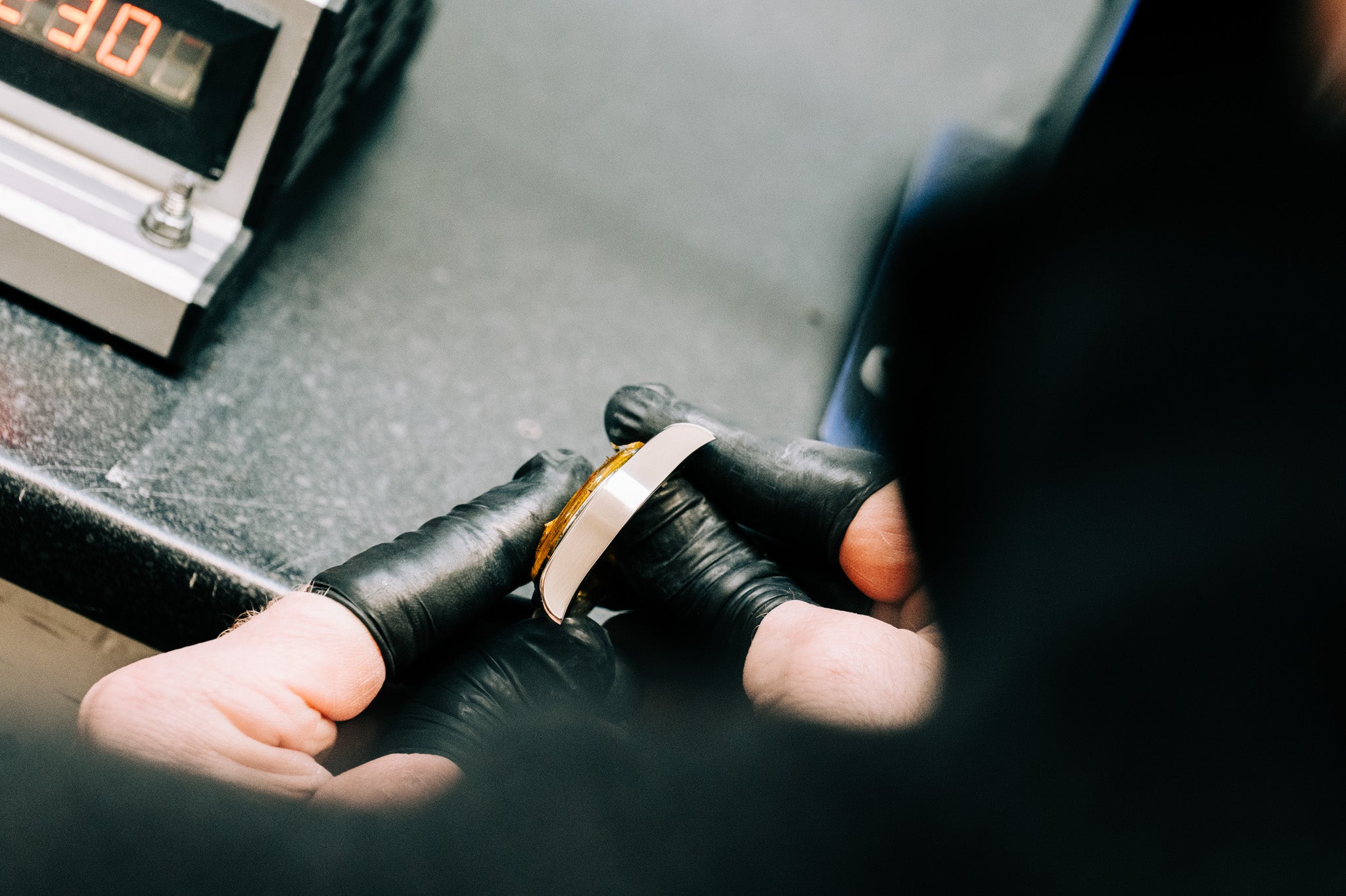A technician holding a silver and gold Cartier watch