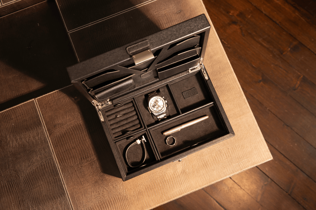Automotive-inspired detailing with a refined, masculine look. A cohesive line covering watch boxes, single stands and matching winders. Shop Roadster.